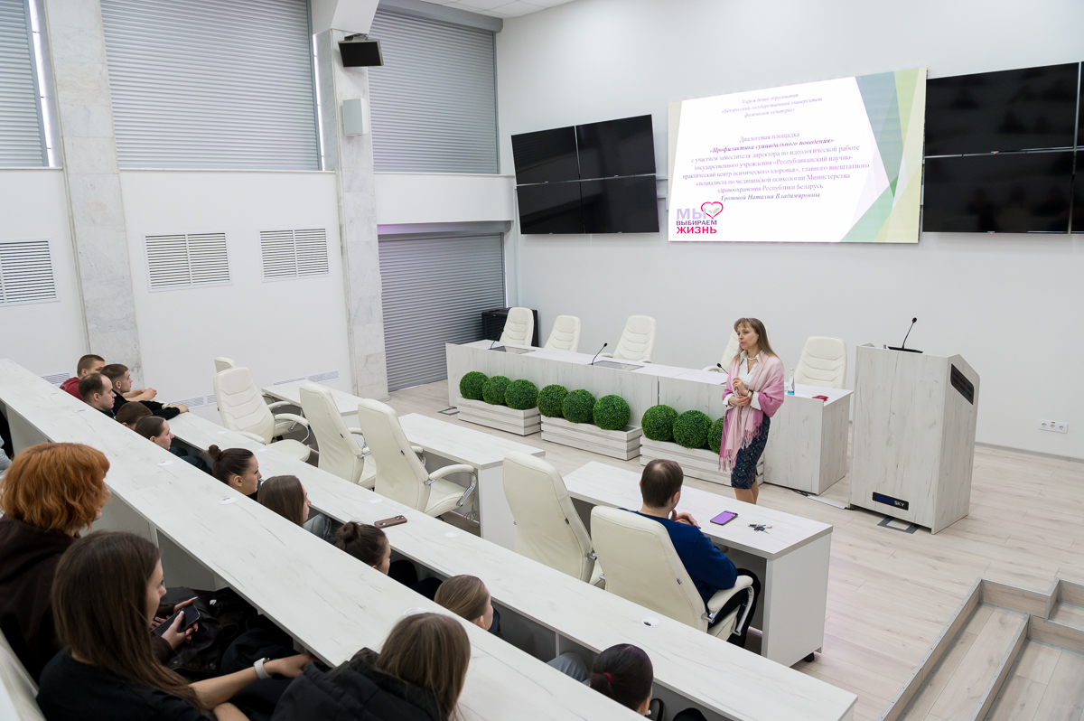 18 февраля 2026 года в университете состоялась диалоговая площадка «Профилактика суицидального поведения». Спикером выступила заместитель директора по идеологической работе государственного учреждения «Республиканский научно-практический центр психического здоровья», главный внештатный специалист по медицинской психологии Министерства здравоохранения Республики Беларусь Наталия Владимировна Громова.
