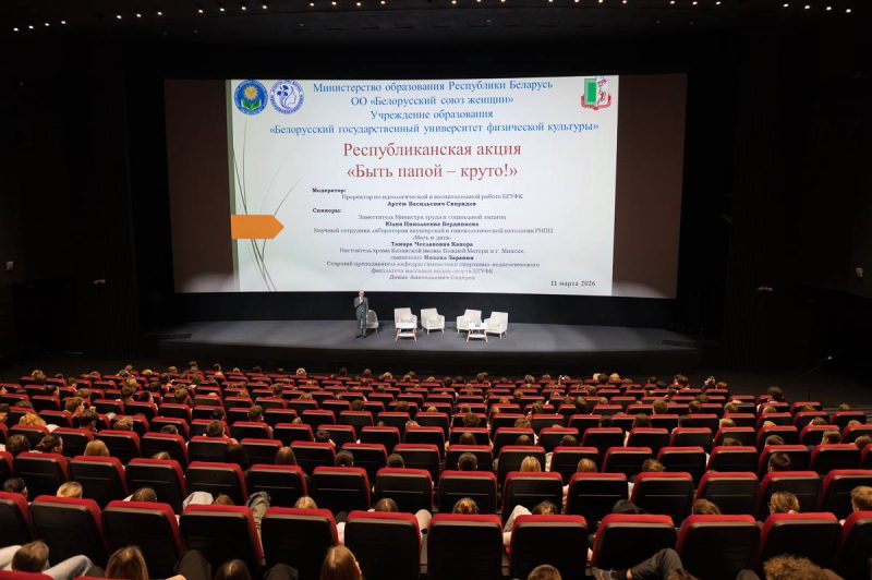 11 марта в кинотеатре «Москва» состоялась республиканская акция «Быть папой — круто!». Участниками мероприятия стали студенты, заместили деканов и преподаватели БГУФК. Модератором выступил проректор по идеологической и воспитательной работе университета Артем Васильевич Свиридов.