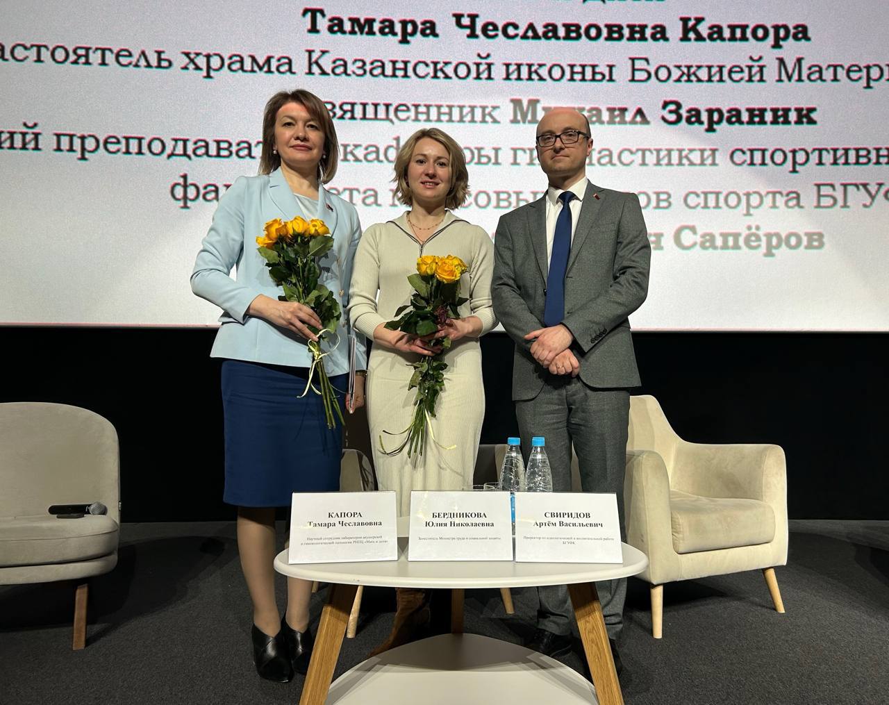 Спикерами выступили заместитель Министра труда и социальной защиты Юлия Николаевна Бердникова; научный сотрудник лаборатории акушерской и гинекологической патологии РНПЦ «Мать и дитя» Тамара Чеславовна Капора; настоятель храма Казанской иконы Божией Матери в г.Минске, священник Михаил Зараник и старший преподаватель кафедры гимнастики БГУФК Денис Николаевич Сапёров.