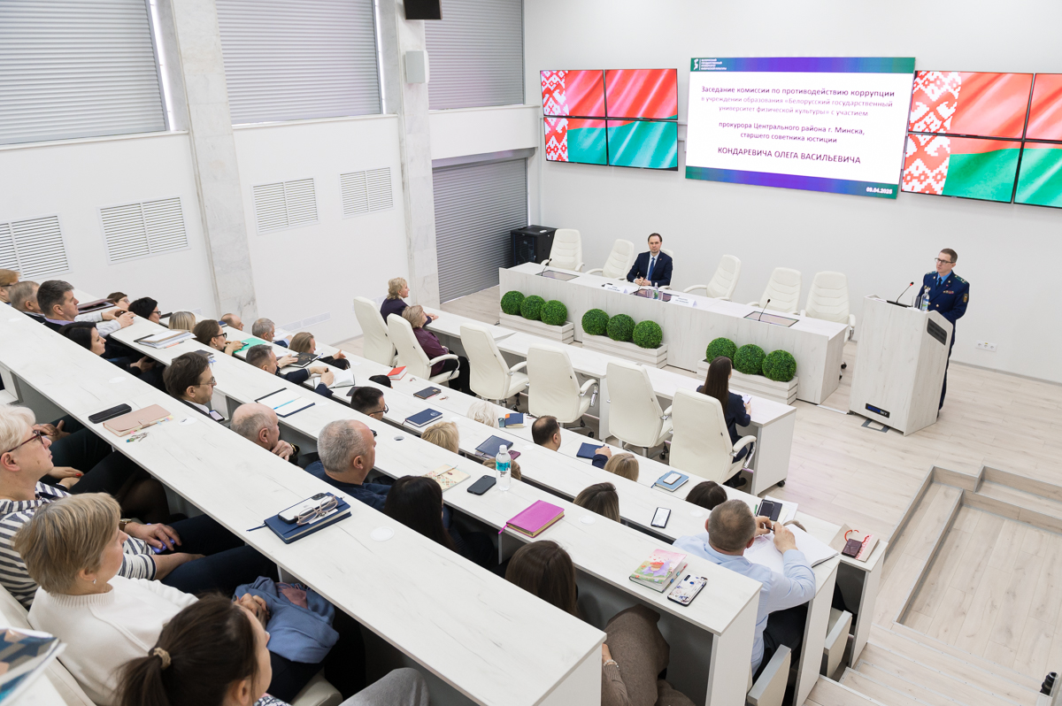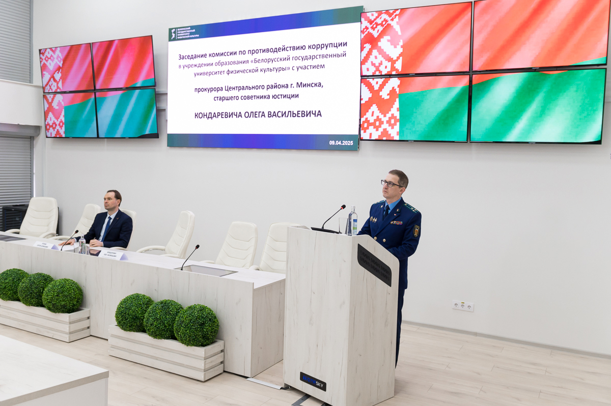 В БГУФК состоялось расширенное заседание комиссии по противодействию коррупции с участием прокурора Центрального района г. Минска, старшего советника юстиции Кондаревича Олега Васильевича.