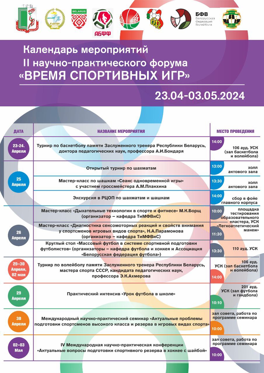 23 апреля 2024 года на спортивно-педагогическом факультете спортивных игр и единоборств начал свою работу II Научно-практический форум «Время спортивных игр». В программу Форума включены спортивные соревнования, проводимые совместно со спортивным клубом университета, научные мероприятия и мастер-классы, методико-практические занятия и экскурсии. В мероприятиях Форума примут участие ведущие специалисты федераций и учебно-спортивных организаций по игровым видам спорта Беларуси, России, Узбекистана, Казахстана, Китая и других стран.