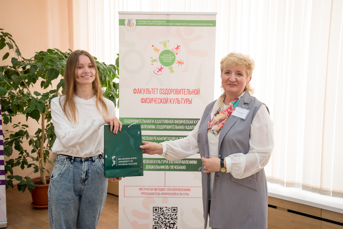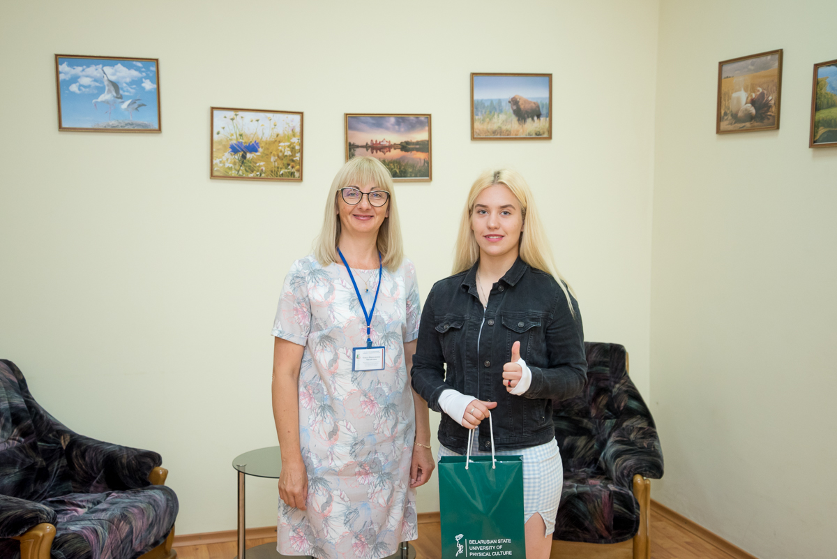 Первая абитуриентка факультета оздоровительной культуры Лапутько Ангелина, родом из г. Слуцка, кандидат в мастера спорта по художественной гимнастике, но выбрала для себя лечебную физическую культуру.