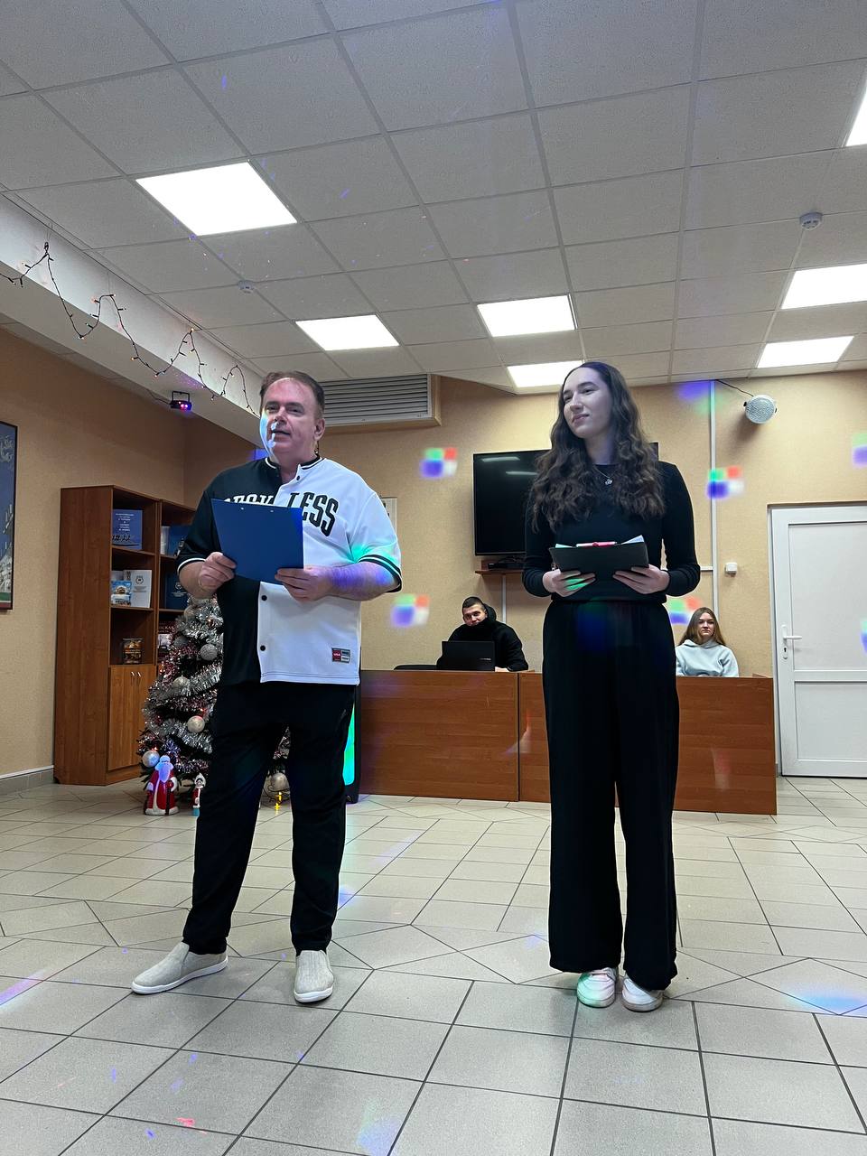 Новогоднюю программу вели ведущая и вокалист Татьяна Кананович, Елизавета Шиманец, воспитатель общежития Алексей Михайлович Городович.