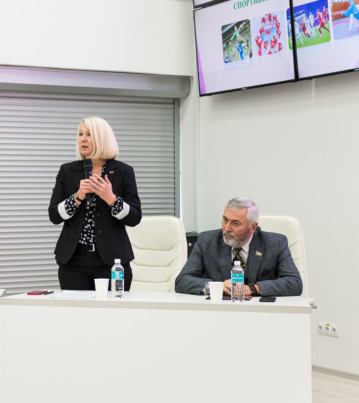 Декан спортивно-педагогического факультета спортивных игр и единоборств Новицкая В.И. поприветствовала сотрудников университета, студентов и почетного гостя. Виктория Ивановна попросила Тенгиза Шукриевича охарактеризовать современное международное положение Республики Беларусь.