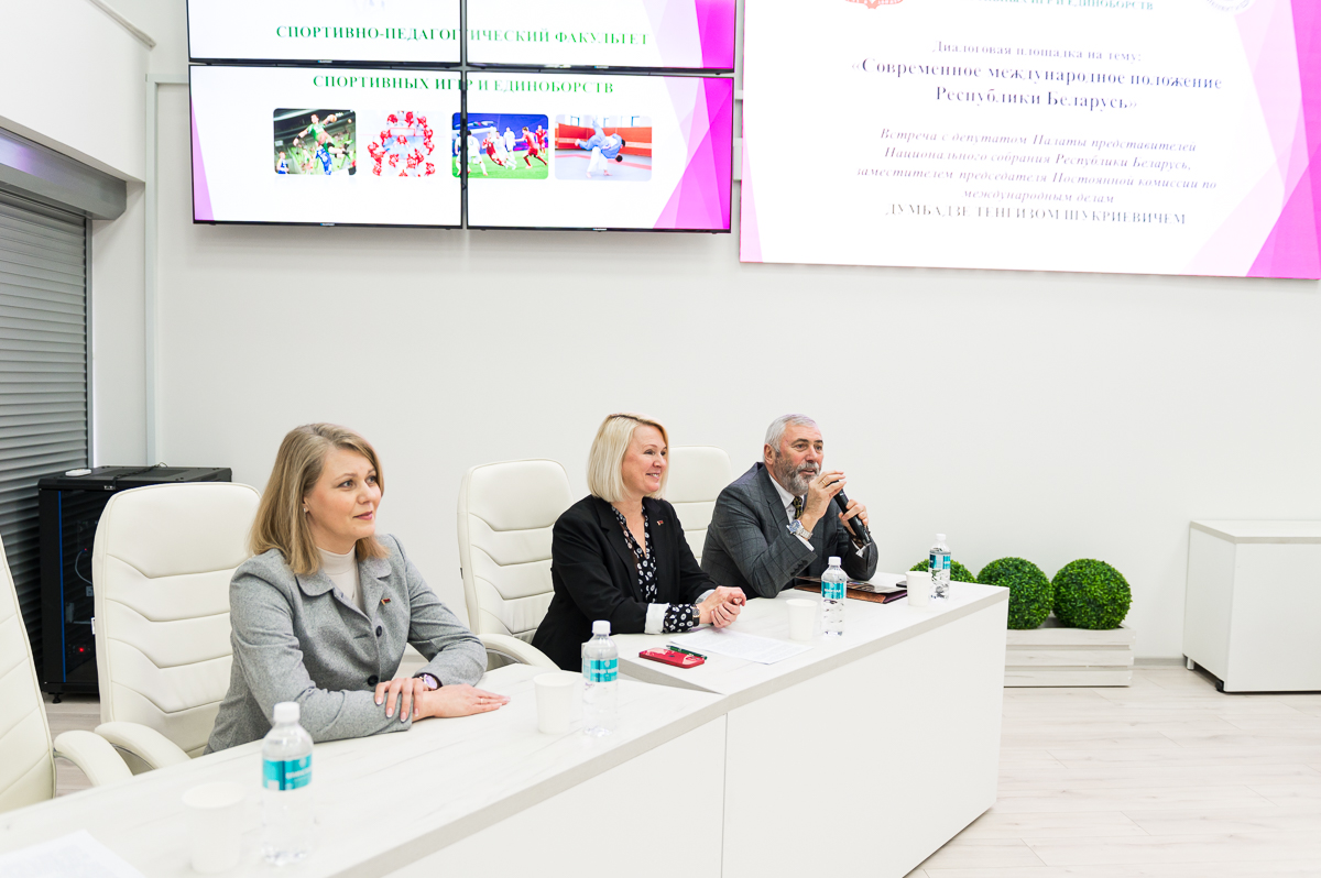 На встрече со студентами и сотрудниками спортивно-педагогического факультета спортивных игр и единоборств присутствовали: депутат Палаты представителей Национального собрания Республики Беларусь, заместитель председателя Постоянной комиссии по международным делам Думбадзе Тенгиз Шукриевич; проректор по научной работе Морозевич-Шилюк Татьяна Анатольевна, кандидат педагогических наук, доцент; декан спортивно-педагогического факультета спортивных игр и единоборств Новицкая Виктория Ивановна, кандидат педагогических наук; начальник отдела воспитательной работы с молодежью Жестков Павел Иванович.