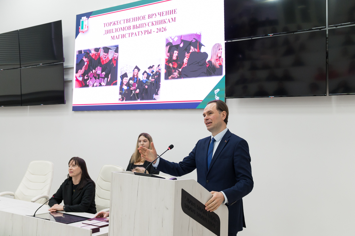 29.01.2026 в зале совета университета состоялась торжественная церемония вручения дипломов 32 выпускникам магистратуры. На церемонии присутствовали научные руководители, профессорско-преподавательский состав кафедр, родные и близкие выпускников. В теплой и дружественной обстановке дипломы выпускникам магистратуры вручили ректор университета Сергей Борисович Репкин и проректор по учебной работе Галина Ивановна Башлакова.