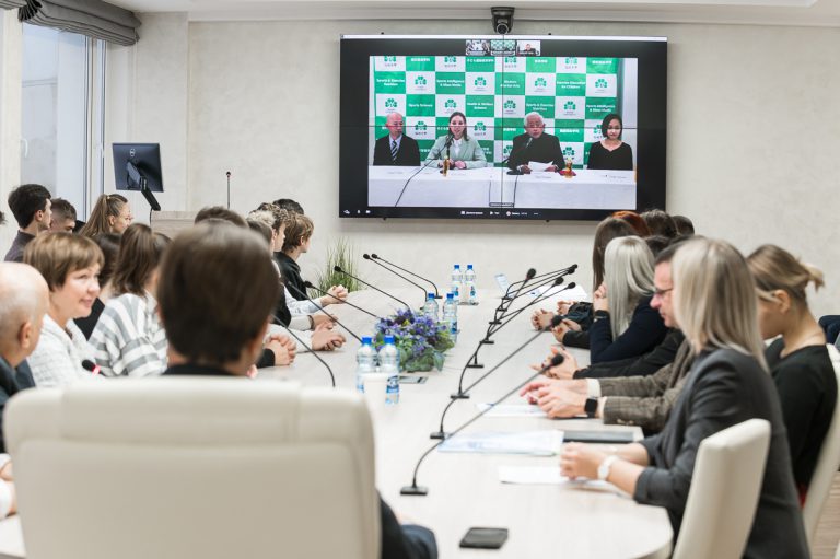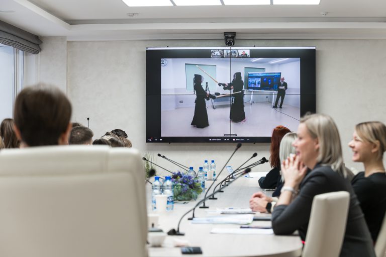 В ходе онлайн-круглого стола «Японское искусство “Кендо” – роль гимнастики в формировании традиционных систем физического воспитания», модератором которого выступила проректор по научной работе БГУФК Морозевич-Шилюк Татьяна Анатольевна, был представлен доклад японских коллег о современных методах диагностики техники упражнений на примере японского вида спорта кендо. Специалисты Сендайского университета в режиме онлайн продемонстрировали работу специального оборудования, которое также может быть применено для анализа техники движений в гимнастических и танцевальных видах спорта, ответили на вопросы слушателей из Беларуси. В ходе оживленной дискуссии ректоры БГУФК и Сендайского университета обсудили будущий визит японской делегации в Беларусь, запланировали мастер-класс с использованием презентуемых технических средств.