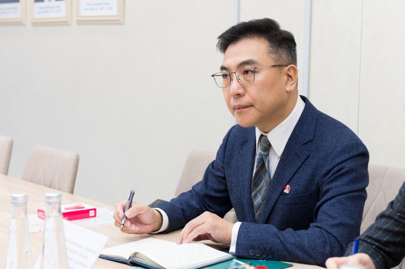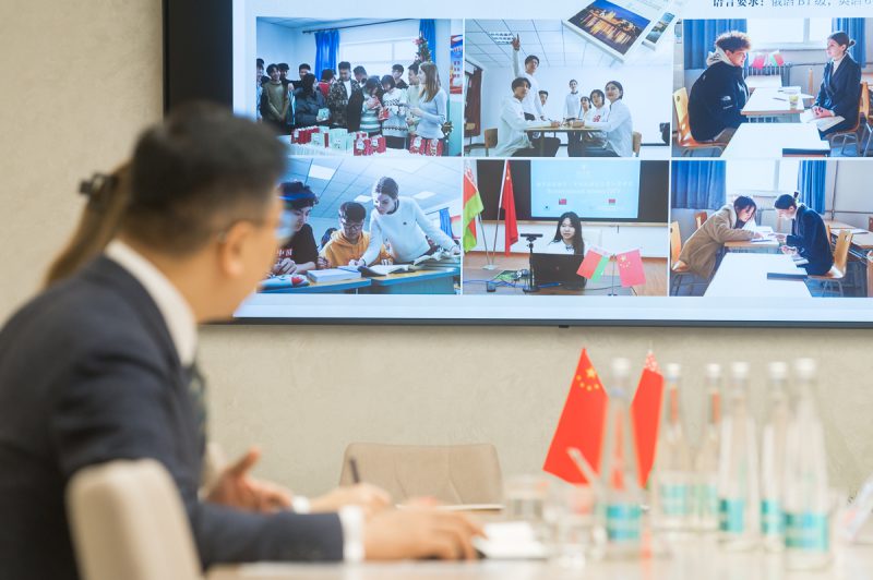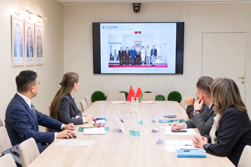 В начале встречи Владимир Владимирович Клинов выступил с презентацией, в которой подробно рассказал о структуре и миссии университета, его образовательных возможностях, реализуемых международных проектах, научной деятельности и спортивной инфраструктуре. Он подчеркнул готовность университета к расширению международного сотрудничества и участию в инициативах, направленных на укрепление образовательных связей между Беларусью и Китаем.