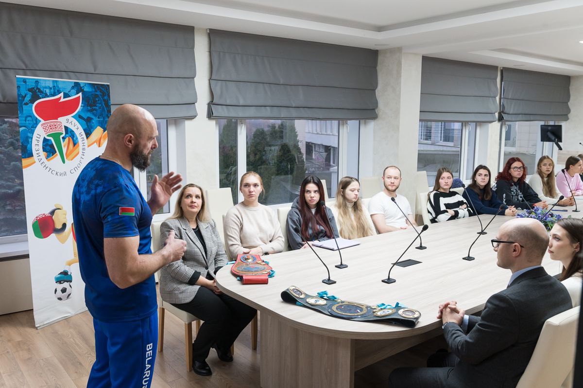 Встреча была не только о спортивных подвигах. Евгений Евгеньевич — еще и блестящий управленец, автор национального республиканского проекта «Гири без границ или спорт для всех». Он поделился со студентами бесценным опытом, который можно смело применять как в спорте, так и в бизнесе.
