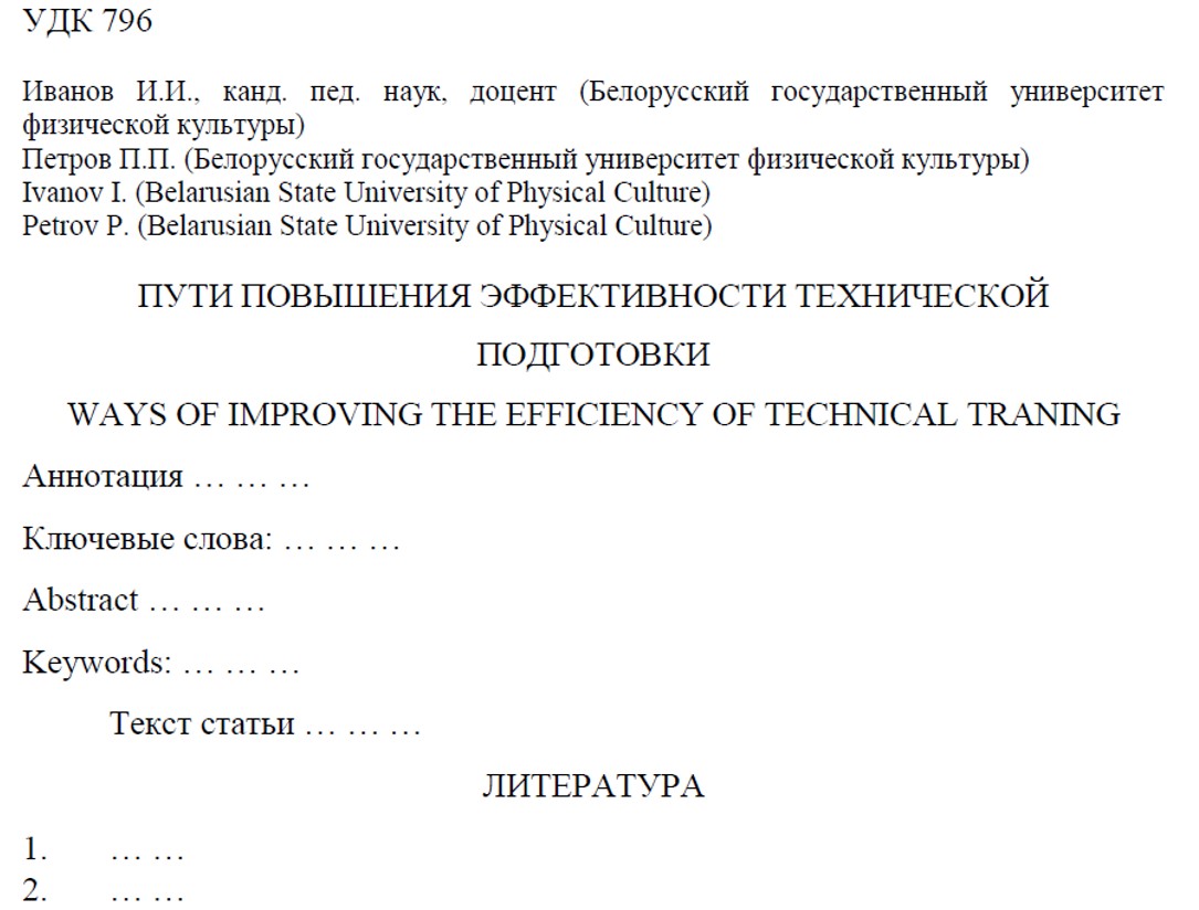 2. Текст рукописи статьи в формате doc, docх (название файла ― фамилия автора(ов), название издания: «Иванов, Петров. Мир спорта»), включающий следующие элементы: