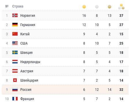 В медальном зачёте победила сборная Норвегии, в активе которой 16 золотых, 8 серебряных и 13 бронзовых медалей. Второе место заняла Германия (12-10-5). Третьим стал Китай (9-4-2).