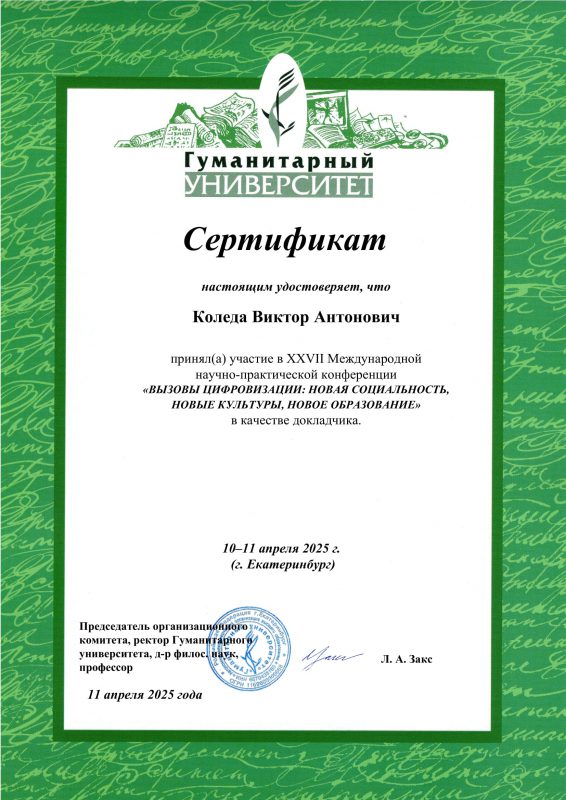 10–11 апреля 2025 года в Автономной некоммерческой организации высшего образования «Гуманитарный университет» (г. Екатеринбург) состоялась XXVII Международная научно-практическая конференция «Вызовы цифровизации: новая социальность, новые культуры, новое образование».