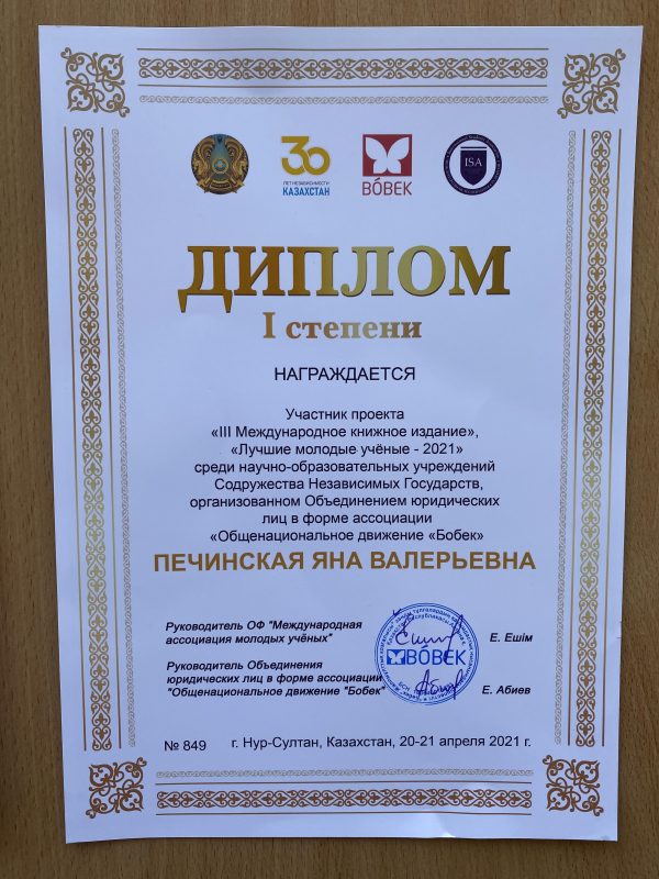 Научная работа признана одной из лучших и опубликована в сборнике научных статей «III Международное книжное издание стран СНГ «Лучший молодой ученый – 2021» с присвоением международного кода ISBN.