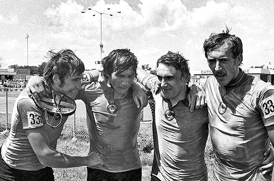 — Какие шутки! До начала состязаний Капитонов предложил нам два варианта маек для гонки. Мы остановили выбор на красных шелковых, в которых до того наши трековики выиграли чемпионат мира, о чем свидетельствовали разноцветные нашивки на рукавах и воротниках. Однако на старте, когда пошел трехминутный обратный отсчет, судья объявил, что форма не соответствует заявленному образцу. Это был шок! Осенило Чуканова, предложившего рукава и воротники просто подвернуть. Арбитры не возражали, и наша четверка отправилась в 100-километровый путь. Мы, как полагается, поочередно сменяли друг друга на позиции лидера и в итоге опередили сборную Польши на 20 секунд.